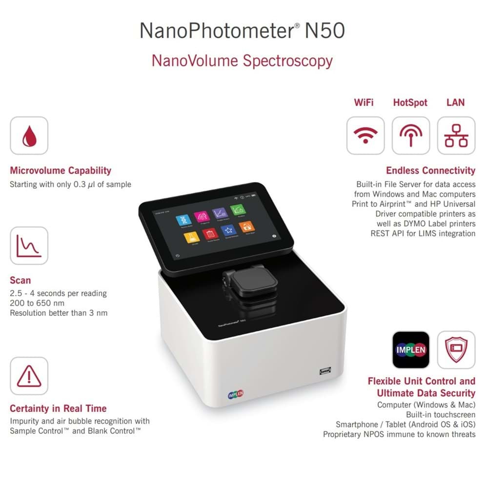 The NanoPhotometer® offers preprogrammed Nucleic Acid methods with options to measure all types of nucleic acids including dsDNA, ssDNA, RNA, miRNA, and Oligos, as well as the option to enter sequences for miRNAs and Oligos as a custom defined extinction coefficient for other types of nucleic acids. It is also possible to measure fluorescent labeled nucleic acids, e.g. as a quality control step during micro array workflows, via the absorbance maxima of the dye. Dye concentration and the frequency of incorporation are automatically calculated and displayed.