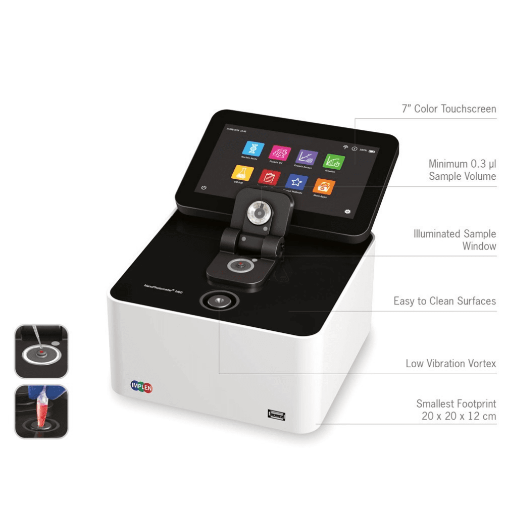 The Implen NP80 offers a wide detection range, cuvette, and microsample measurements. Together with the built-in vortex, you have everything to perform high-end nano measurements. When you don't need a cuvette option but are looking for a wide detection range and outstanding measurements, the Implen N60 is the best system for you. If you can also live without a built-in vortex, go for the Implen N50. The Implen C40 consists of a cuvette reader that offers a broad spectrum scan of 200-900 nm but no micro-sample measurements.