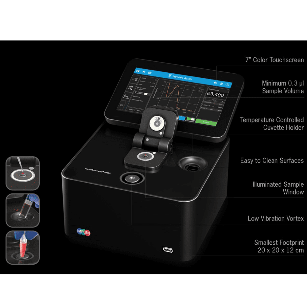 The Implen NP80 offers a wide detection range, cuvette, and microsample measurements. Together with the built-in vortex, you have everything to perform high-end nano measurements. When you don't need a cuvette option but are looking for a wide detection range and outstanding measurements, the Implen N60 is the best system for you. If you can also live without a built-in vortex, go for the Implen N50. The Implen C40 consists of a cuvette reader that offers a broad spectrum scan of 200-900 nm but no micro-sample measurements.